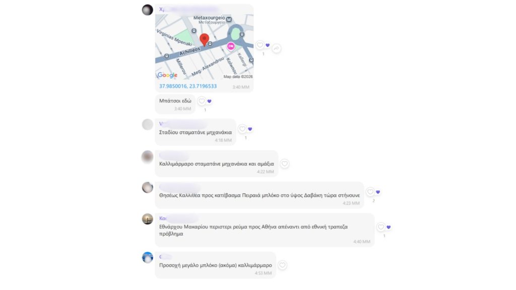 Σέ άλλη ομαδική ένα μέλος έστειλε την τοποθεσία μπλόκου της τροχαίας, μέσω της εφαρμογής Google Maps και οι υπόλοιποι χρήστες σχολίασαν και έστειλαν περεταίρω πληροφορίες για δρόμους κοντά στο μπλόκο. Ένας χρήστης γράφει συγκεκριμένα: «Σταδίου σταματάνε μηχανάκια», ενώ άλλος σημειώνει πως στο Καλλιμάρμαρο σταματάνε και μηχανάκια και αμάξια. Ακόμη πολλά μέλη σε ομάδες στέλνουν και οπτικοακουστικό υλικό από σημεία που υπάρχουν τοποθετημένες κάμερες ή που βρίσκεται κάποιο μπλόκο της τροχαίας.
