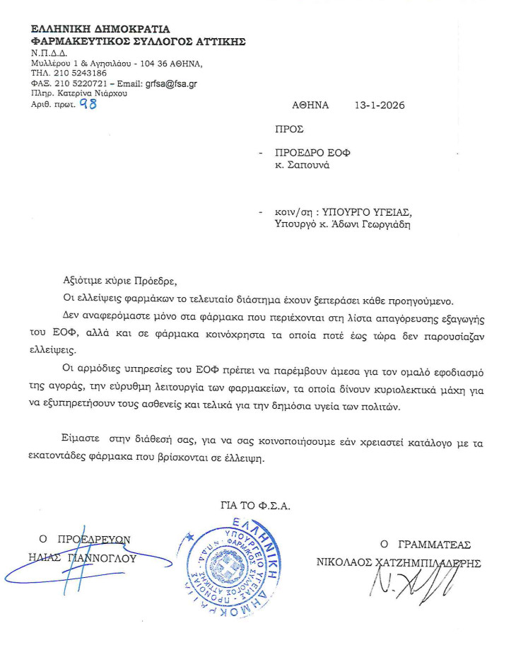 Μάλιστα, για το θέμα που έχει ανακύψει, το προεδρείο του Φαρμακευτικού Συλλόγου Αττικής (ΦΣΑ) έστειλε την περασμένη Παρασκευή επιστολή στον πρόεδρο του ΕΟΦ, Σπυρίδωνα Σαπουνά, την οποία κοινοποίησε και στον υπουργό Υγείας Αδωνι Γεωργιάδη.