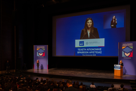 Με την υποστήριξη του Υπουργείου Παιδείας, Θρησκευμάτων και Αθλητισμού, το Ίδρυμα Κρατικών Υποτροφιών (ΙΚΥ), πραγματοποίησε χθες, Δευτέρα 19 Ιανουαρίου 2026, στην αίθουσα «Αλεξάνδρα Τριάντη» του Μεγάρου Μουσικής Αθηνών, την επίσημη τελετή απονομής των Βραβείων Αριστείας στους/στις πρωτεύσαντες/σες εισαχθέντες/είσες όλων των Σχολών και Τμημάτων των Ιδρυμάτων Τριτοβάθμιας Εκπαίδευσης της χώρας. Τα βραβεία απένειμε η Υπουργός Παιδείας, Θρησκευμάτων και Αθλητισμού, Σοφία Ζαχαράκη.