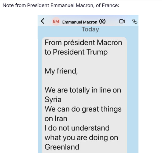 Σύμφωνα με το περιεχόμενο του μηνύματος, ο Μακρόν αναφέρει ότι «συμφωνούμε απόλυτα στο θέμα της Συρίας» και ότι «μπορούμε να κάνουμε σημαντικά πράγματα αναφορικά με το Ιράν», προσθέτοντας ωστόσο: «δεν καταλαβαίνω τι κάνεις με τη Γροιλανδία».