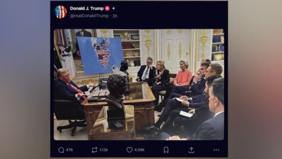 Οι εικόνες αυτές προκάλεσαν σάλο, καθώς ο Τραμπ παρουσιάζει τη Γροιλανδία –και όχι μόνο– ως αμερικανική, με τους Ευρωπαίους να παρακολουθούν. Η δεύτερη φωτογραφία βασίζεται σε πραγματική λήψη του Αυγούστου 2025, όταν Ευρωπαίοι ηγέτες επισκέφθηκαν την Ουάσιγκτον μετά την επικοινωνία του Αμερικανού προέδρου με τον Ρώσο ομόλογό του, Βλαντίμιρ Πούτιν.