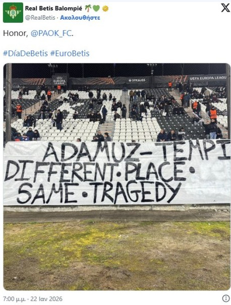 «Αδαμούθ, Τέμπη. Διαφορετικά μέρη, ίδια τραγωδία», έγραφε το πανό στα αγγλικά. Η Μπέτις σχολίασε θετικά το πανό και έδωσε συγχαρητήρια.