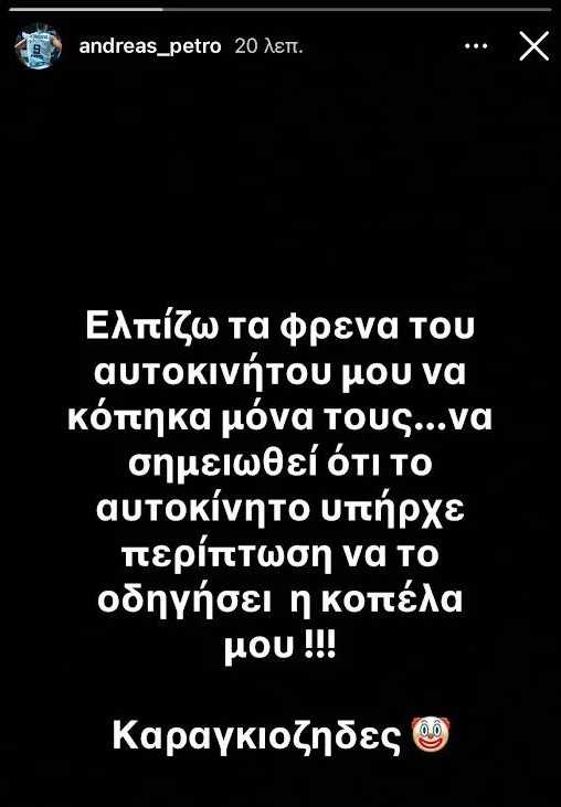 Συγκεκριμένα έγραψε: “Ελπίζω τα φρένα του αυτοκινήτου μου να κόπηκαν μόνα τους… Να σημειωθεί ότι το αυτοκίνητο υπήρχε περίπτωση να το οδηγήσει η κοπέλα μου. Καραγκιόζηδες”.