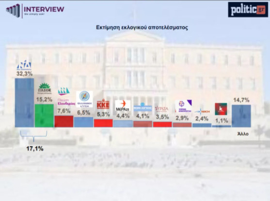 - Η Νέα Δημοκρατία διατηρεί σαφές προβάδισμα με εκτίμηση εκλογικού αποτελέσματος στο 32,3%, διαφορά 17 μονάδων από το ΠΑΣΟΚ που συγκεντρώνει 15,2%.
