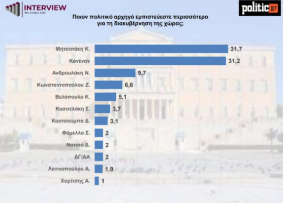 Oι πολίτες εμφανίζονται πιο έντονα να εμπιστεύονται τον Κυριάκο Μητσοτάκη για τη διακυβέρνηση της χώρας, με ποσοστό 31,7%, σχεδόν ισοβαθμώντας με εκείνους που δηλώνουν ότι δεν εμπιστεύονται κανέναν πολιτικό (31,2%).