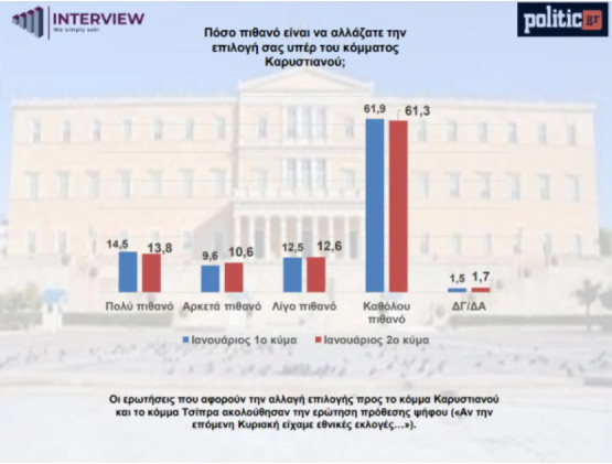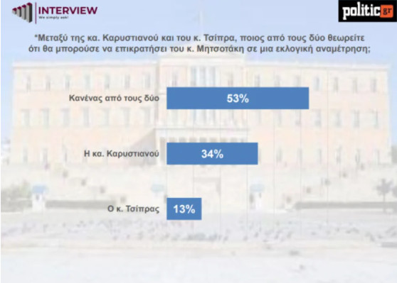 Στην ερώτηση για το ποιος έχει περισσότερες πιθανότητες να επικρατήσει του Κυριάκου Μητσοτάκη, η Μαρία Καρυστιανού συγκεντρώνει 34%, ο Αλέξης Τσίπρας 13%, ενώ το 53% απαντά «κανένας από τους δύο».