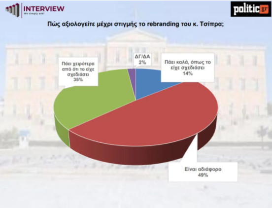 Όσον αφορά την προσπάθεια rebranding του Αλέξη Τσίπρα, το 49% των ερωτηθέντων τη θεωρεί αδιάφορη, το 35% πιστεύει ότι εξελίσσεται χειρότερα από τον αρχικό σχεδιασμό και το 14% ότι πηγαίνει καλά.