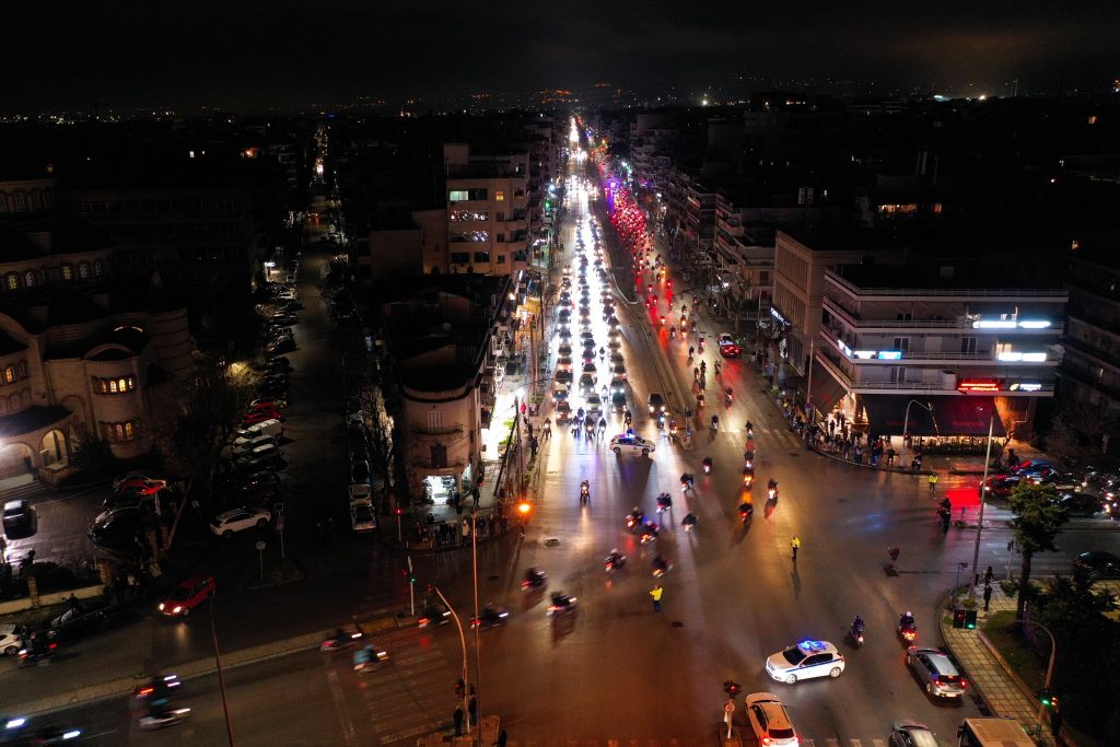 Λίγο πριν από τις 19:00 ξεκίνησε η αυτοκινητοπομπή των φιλάθλων μέσω της Λεωφόρου Γεωργικής Σχολής, της οδού Εθνικής Αντιστάσεως, της Λεωφόρου Βασιλίσσης Όλγας, της οδού Βούλγαρη, της Λεωφόρου Κωνσταντίνου Καραμανλή και κατέληξε στην οδό Κλεάνθους, όπου βρίσκεται το γήπεδο της ομάδας.