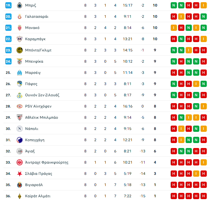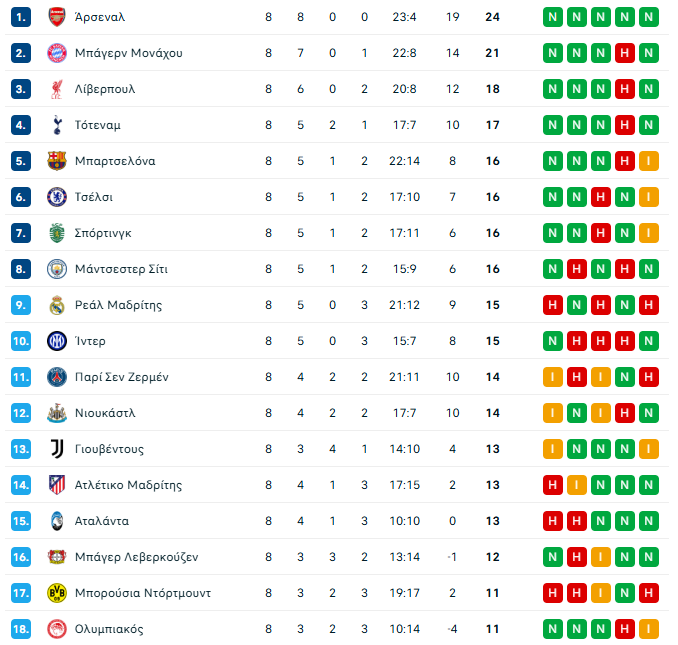 Όσον αφορά την κορυφή, η Άρσεναλ νίκησε και την Καϊράτ στο «Emirates» με 3-2 και έκανε το 8/8 στη League Phase κι έγινε η πρώτη ομάδα που το καταφέρνει, τερματίζοντας 1η, ενώ στη 2η θέση βρίσκεται η Μπάγερν που νίκησε με 2-1 την Αϊντχόφεν εκτός έδρας.