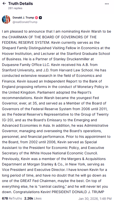 • Ο Τραμπ δήλωσε μέσω του λογαριασμού του στο Truth Social ότι γνωρίζει τον Κέβιν Γουόρς για μεγάλο χρονικό διάστημα και ότι πιστεύει πως “θα μείνει στην ιστορία ως ένας από τους ΜΕΓΑΛΟΥΣ προέδρους της Fed, ίσως ο καλύτερος”.