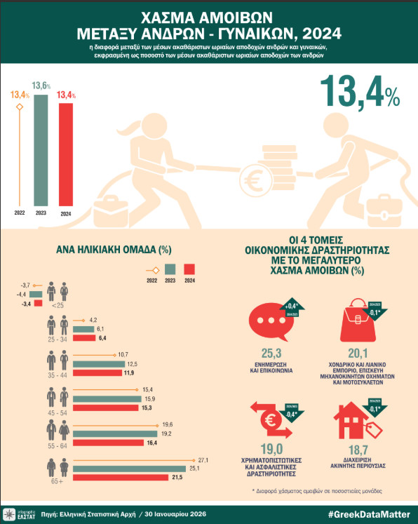 - Σύμφωνα με στοιχεία της Ελληνικής Στατιστικής Αρχής, το μισθολογικό χάσμα μεταξύ ανδρών και γυναικών στην Ελλάδα παραμένει σημαντικό και δεν έχει μειωθεί ουσιαστικά.