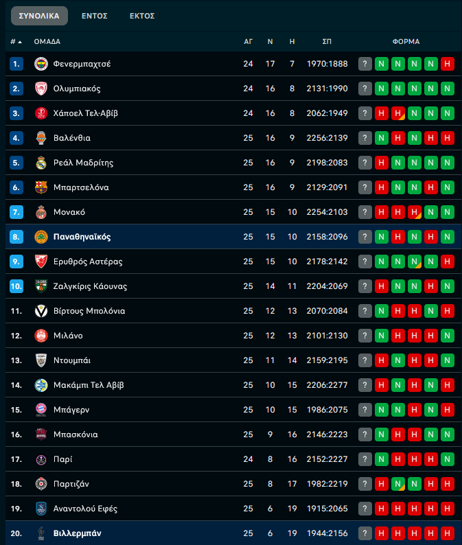 Η βαθμολογία στη Euroleague σε 25 αγώνες