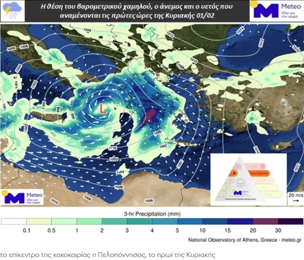 Το χαμηλό βαρομετρικό επηρεάζει σχεδόν όλη τη χώρα από νωρίς το πρωί της Κυριακής, με ιδιαίτερη ένταση σε Τρίπολη και Καλαμάτα. Ακολουθούν η Θεσσαλία και η βόρεια Εύβοια, ενώ το βράδυ τα φαινόμενα μεταφέρονται στα νησιά του βορειοανατολικού Αιγαίου.