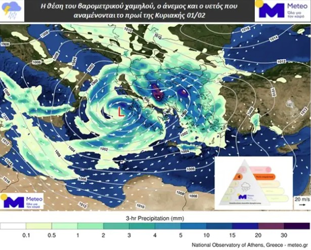 Η ΕΜΥ επισημαίνει ότι την Κυριακή 1 Φεβρουαρίου 2026 αναμένονται ισχυρές βροχές και καταιγίδες στις περισσότερες περιοχές της χώρας, με φαινόμενα μεγάλης διάρκειας. Οι άνεμοι θα φτάσουν τοπικά τα 8 με 9 μποφόρ, ενώ δεν αποκλείονται χαλαζοπτώσεις.