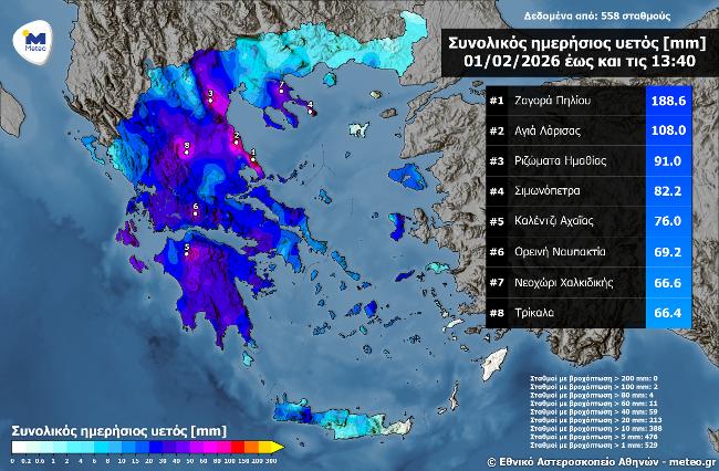 Μεγάλα ύψη βροχής καταγράφηκαν έως το μεσημέρι της Κυριακής 1 Φεβρουαρίου 2026. Σύμφωνα με το δίκτυο αυτόματων μετεωρολογικών σταθμών του meteo.gr / Εθνικού Αστεροσκοπείου Αθηνών, το μεγαλύτερο ύψος βροχής έως τις 13:40 καταγράφηκε στο Πήλιο και πιο συγκεκριμένα στη Ζαγορά Πηλίου (189 χιλιοστά).