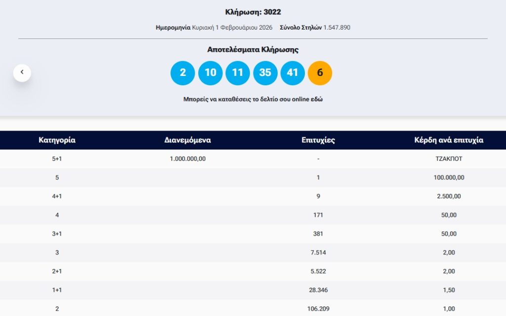 Πραγματοποιήθηκε το βράδυ της Κυριακής (1/2) η κλήρωση 3022 του Τζόκερ που μοιράζει στην πρώτη κατηγορία 1.000.000 ευρώ.