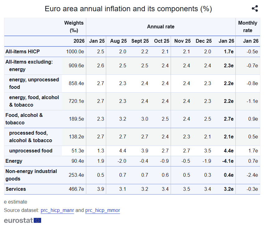 - Στην ευρωζώνη, ο ετήσιος πληθωρισμός διαμορφώθηκε στο 1,7% τον Ιανουάριο 2026, από 2% τον Δεκέμβριο 2025.
