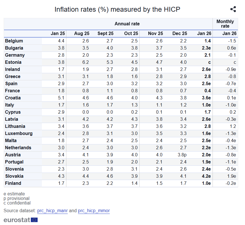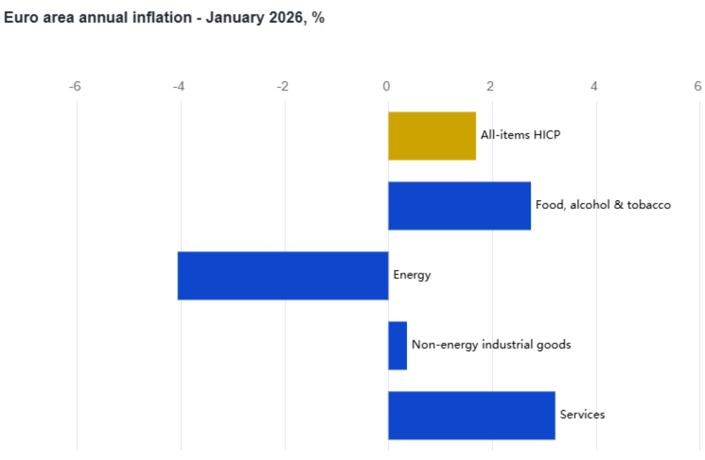 Στην ευρωζώνη, ο ετήσιος πληθωρισμός διαμορφώθηκε στο 1,7% τον Ιανουάριο 2026, έναντι 2% τον Δεκέμβριο 2025, επιβεβαιώνοντας τη γενικότερη τάση επιβράδυνσης των τιμών σε ευρωπαϊκό επίπεδο.