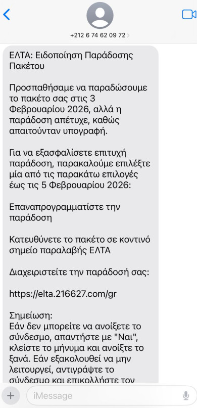 Τα μηνύματα φέρουν την ένδειξη «ΕΛΤΑ: Ειδοποίηση Παράδοσης Πακέτου» και περιλαμβάνουν οδηγίες σχετικά με δήθεν αποτυχημένη προσπάθεια παράδοσης. Αναφέρουν συγκεκριμένες ημερομηνίες, όπως «29 Ιανουαρίου 2026», υποστηρίζοντας ότι η παράδοση δεν ολοκληρώθηκε επειδή απαιτούνταν υπογραφή.