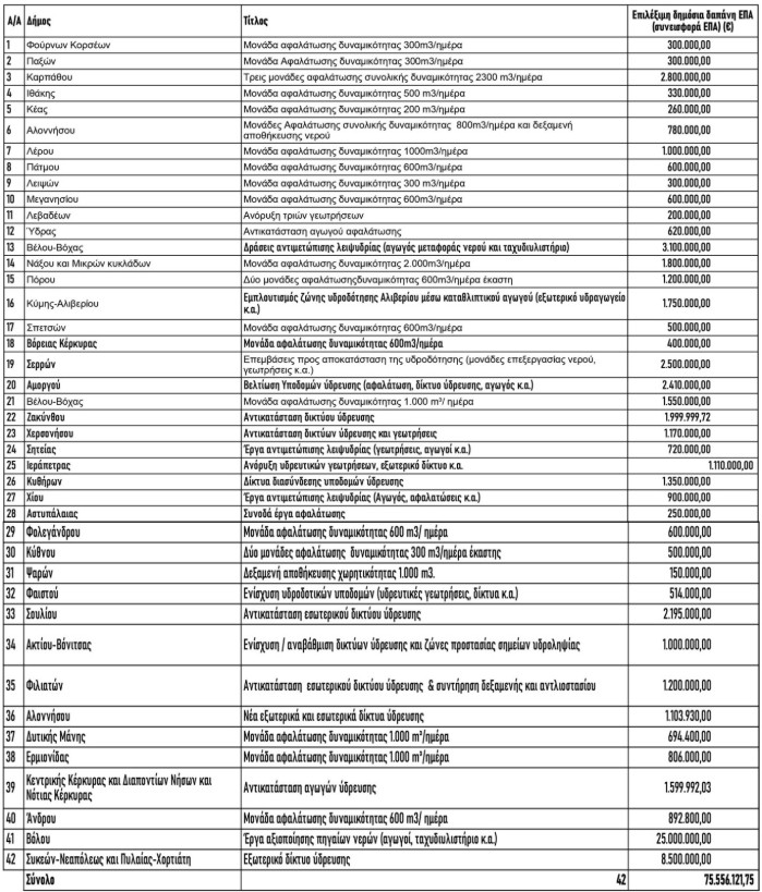 Ειδικότερα, το ποσό δεσμεύθηκε από το Τομεακό Πρόγραμμα Ανάπτυξης 2025 του υπουργείου Περιβάλλοντος και Ενέργειας και αφορά, μεταξύ άλλων, στη δημιουργία και τον εκσυγχρονισμό μονάδων αφαλάτωσης, στη βελτίωση και αντικατάσταση δικτύων ύδρευσης, σε δράσεις αξιοποίησης πηγαίων νερών (αγωγοί, ταχυδιυλιστήρια) κ.ά.