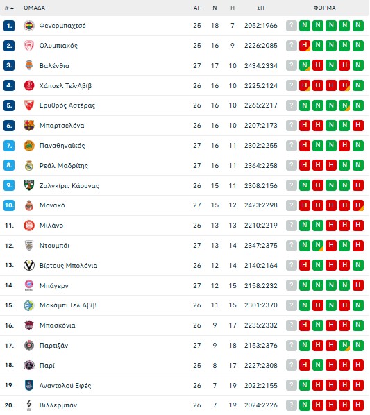 Ο Παναθηναϊκός, δεν κατάφερε να κεφαλοποιήσει τη μεγάλη νίκη του επί της Ρεάλ Μαδρίτης στο ΟΑΚΑ, αφού υπέστη βαριά ήττα από την Παρτίζαν στο Βελιγράδι. Έτσι οι Πράσινοι έπεσαν στο 16-11, ενώ οι Σέρβοι βελτίωσαν το ρεκόρ τους στο 9-18, παραμένοντας όμως πολύ χαμηλά.