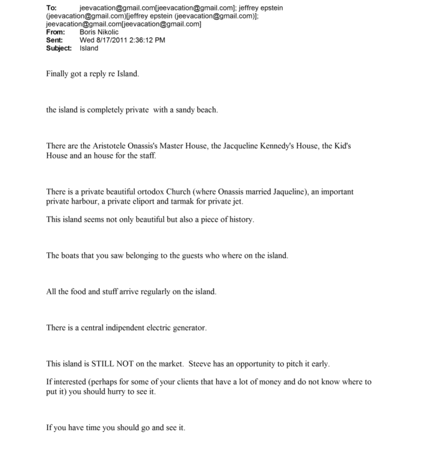 Λίγες ημέρες αργότερα, ο Επστάιν ζήτησε επιπλέον πληροφορίες για το αν η ακτή του νησιού είναι ιδιωτική ή δημόσια. Ο Νίκολιτς απάντησε ότι θα το ελέγξει, υπενθυμίζοντας ωστόσο πως το νησί «δεν είναι επίσημα προς πώληση».