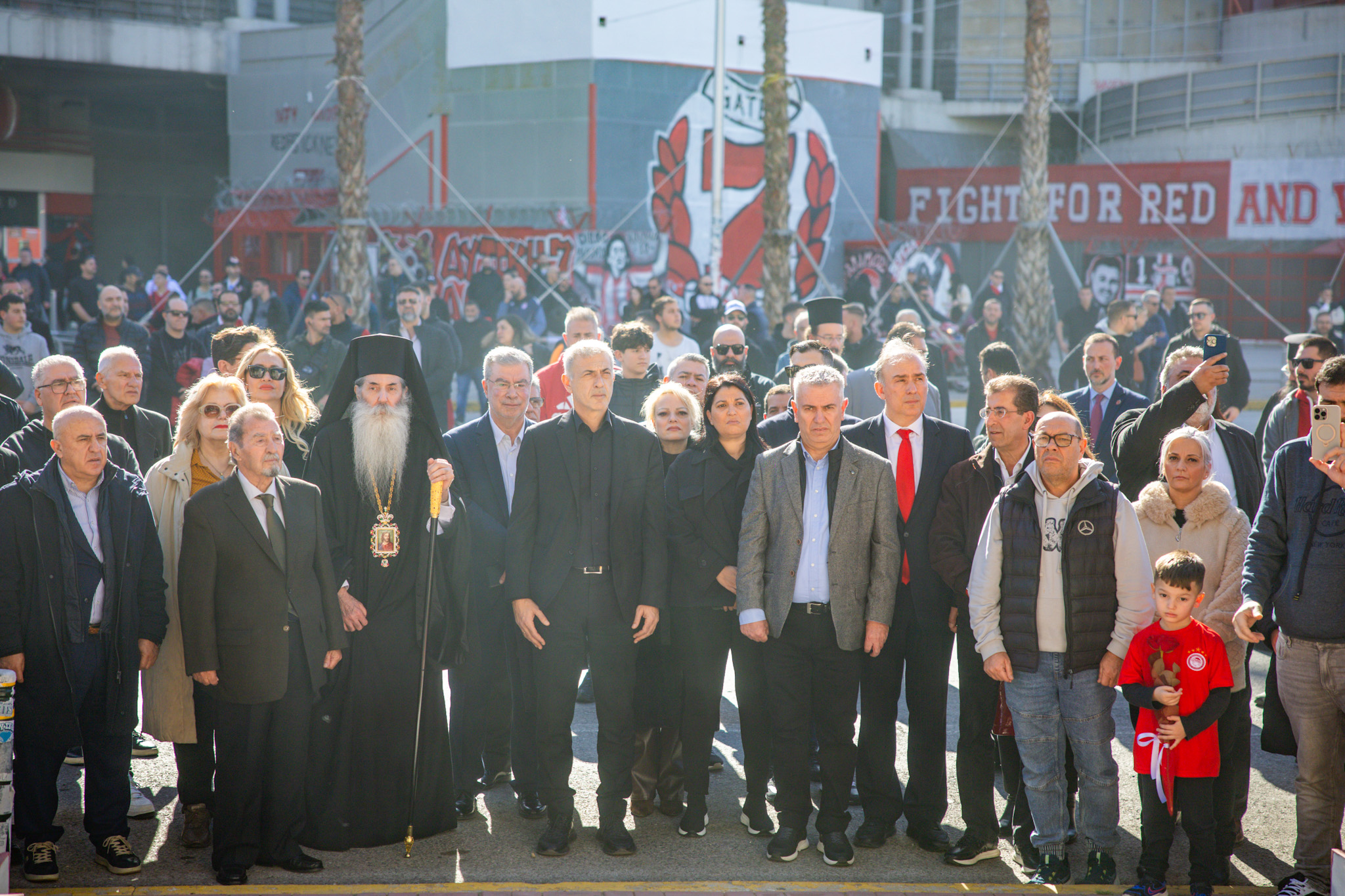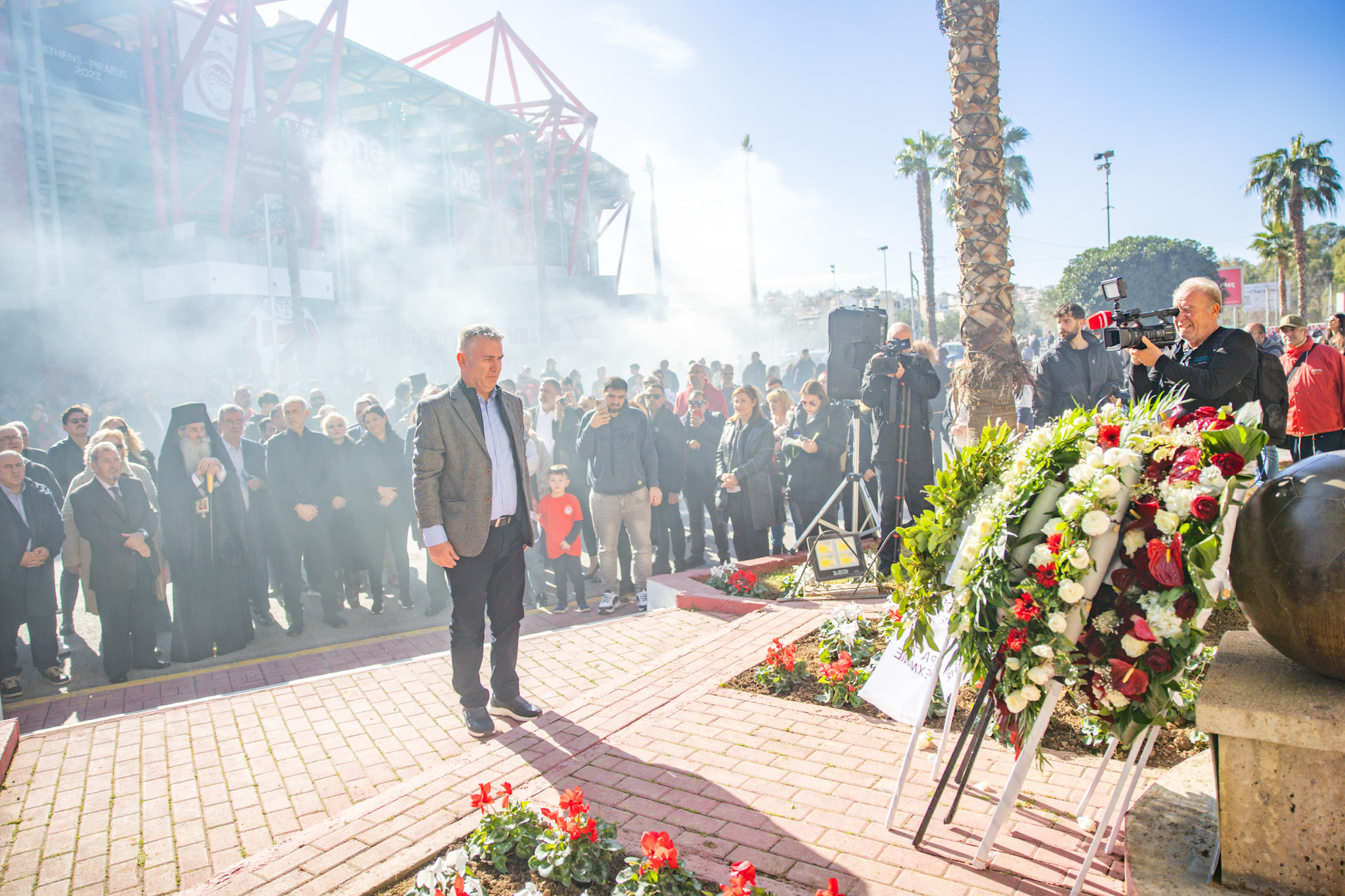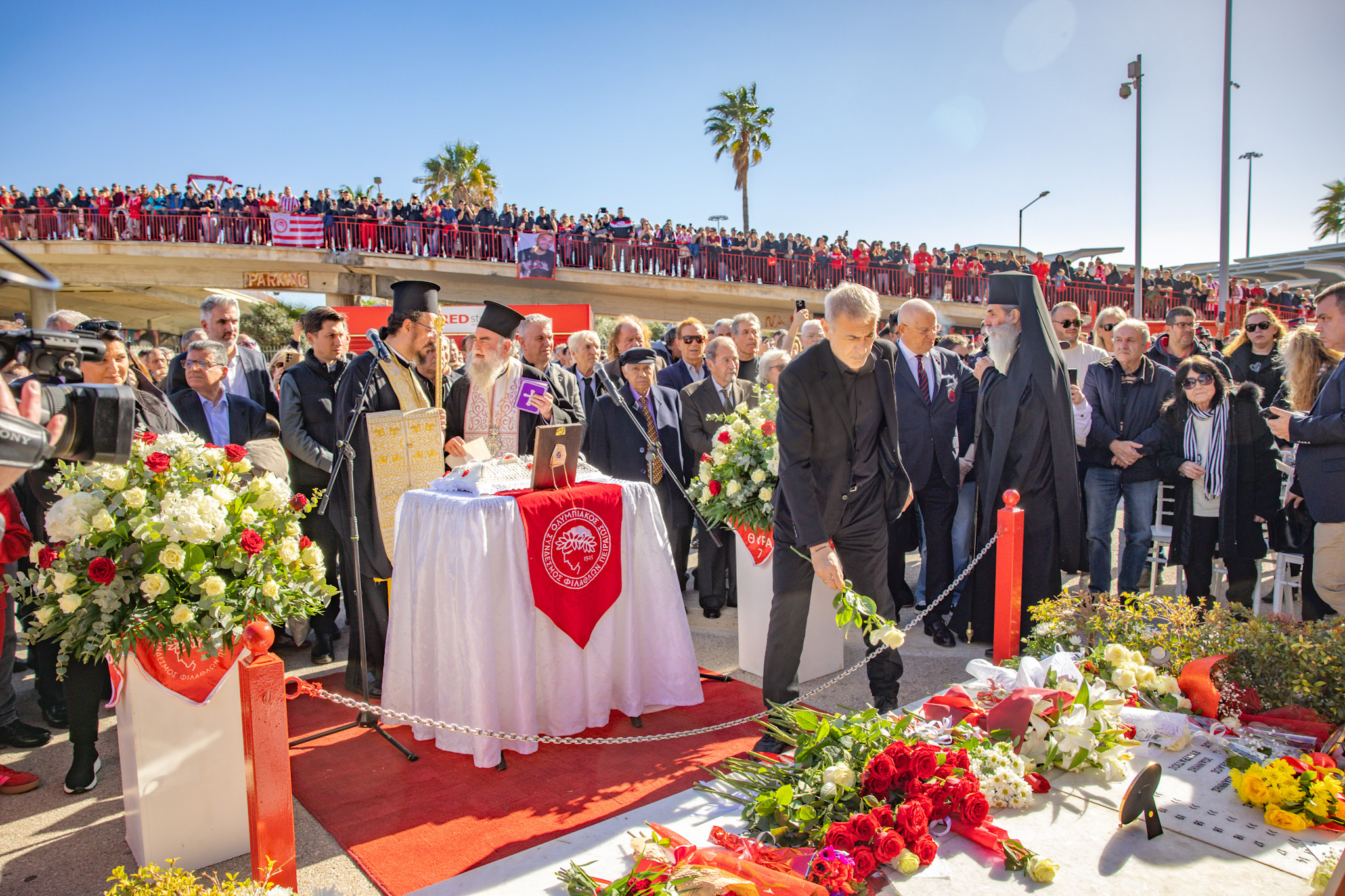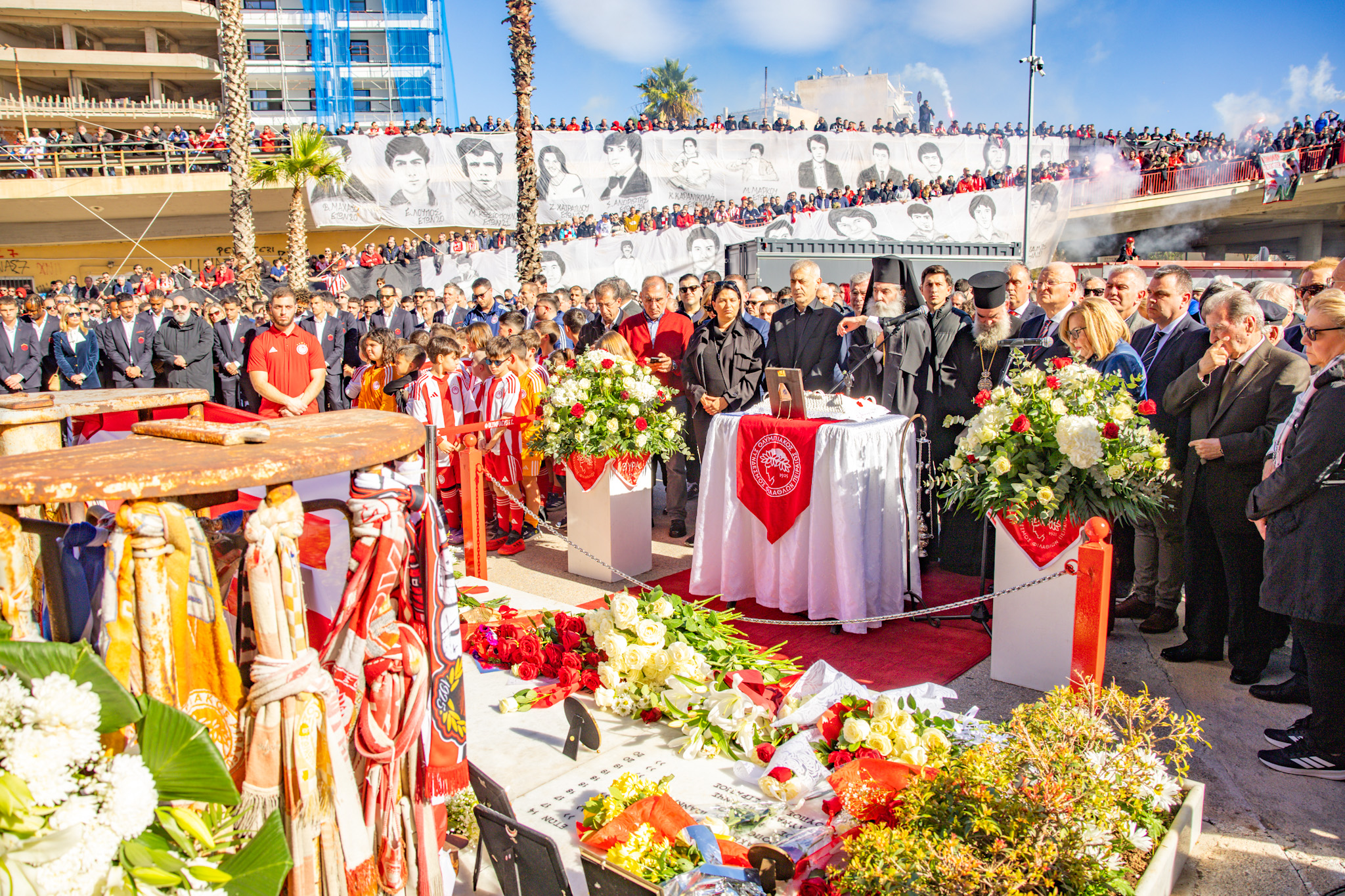 Η επιμνημόσυνη δέηση που τέλεσε ο Σεβασμιώτατος Μητροπολίτης Πειραιώς και Φαλήρου κ.κ. Σεραφείμ, πραγματοποιήθηκε παρουσία του Δημάρχου Πειραιά, Γιάννη Μώραλη, του Προέδρου της ΠΑΕ Ολυμπιακός, Ευάγγελου Μαρινάκη, των Προέδρων της ΚΑΕ Ολυμπιακός, Παναγιώτη και Γιώργου Αγγελόπουλου, του Προέδρου του Ερασιτέχνη Ολυμπιακού Μιχάλη Κουντούρη, μελών της Διοίκησης της ΠΑΕ Ολυμπιακός, σύσσωμου του ποδοσφαιρικού τμήματος, όλων των τμημάτων των Ερυθρόλευκων, καθώς και πλήθους κόσμου.