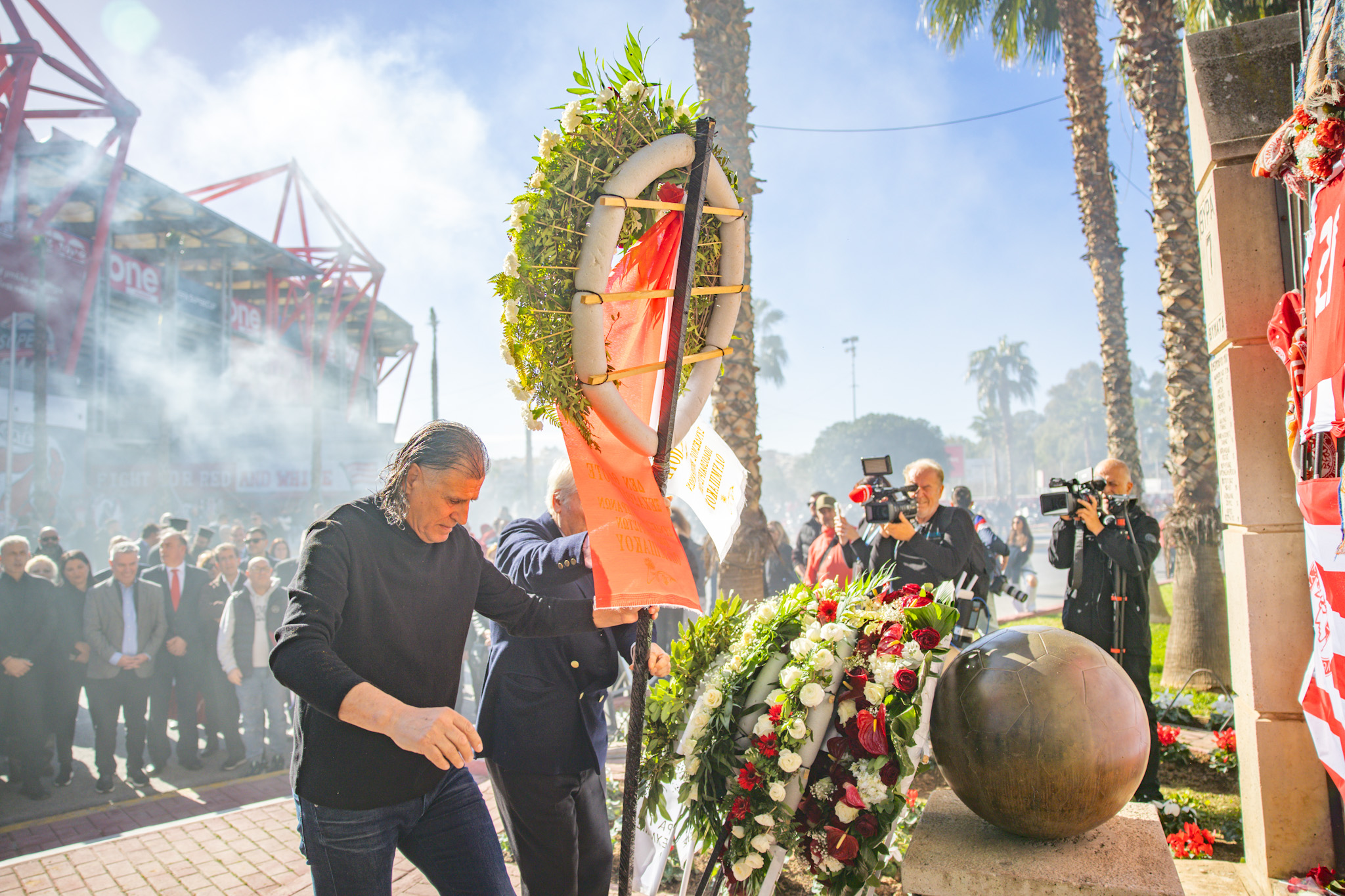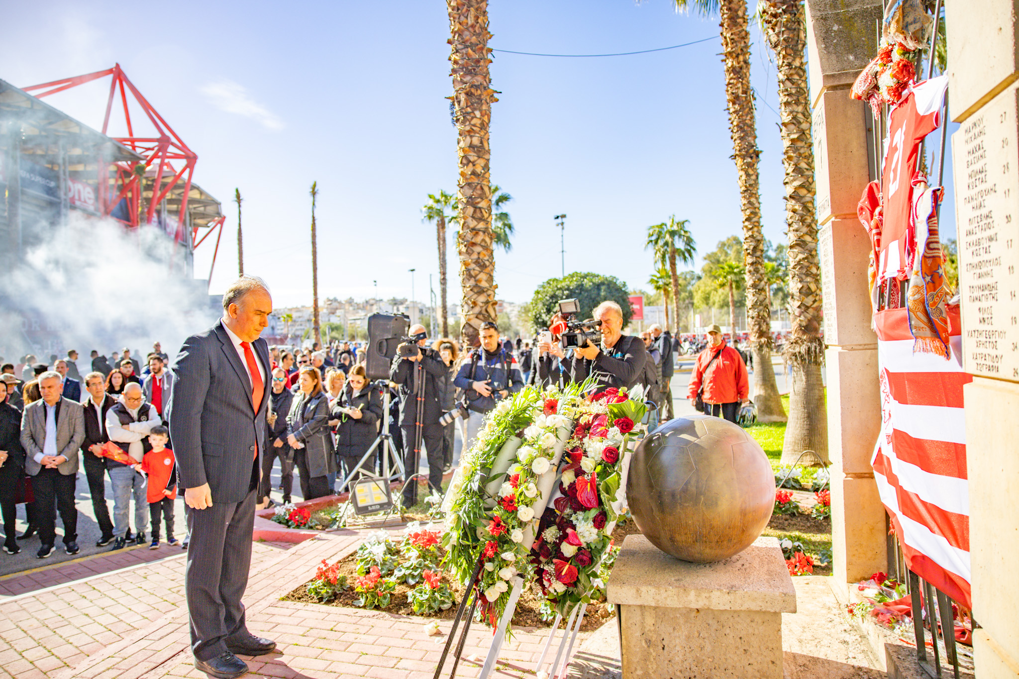 Ακολούθησε κατάθεση στεφάνων στο Μνημείο του Δήμου Πειραιά, στην πλατεία Θυμάτων Θύρας 7, από τον Πρόεδρο της ΠΑΕ Ολυμπιακός Ευάγγελο Μαρινάκη, τον Δήμαρχο Πειραιά Γιάννη Μώραλη, τον Δήμαρχο Δάφνης – Υμηττού Νικόλαο Τσιλίφη, τον Δήμαρχο Νίκαιας – Αγίου Ι. Ρέντη Κωνσταντίνο Μαραγκάκη και τον Πρόεδρο του Συνδέσμου Βετεράνων Ποδοσφαιριστών Ολυμπιακού Πειραιώς, Ιωάννη Γκαϊτατζή. Στεφάνι κατέθεσε και η Ένωση Ποδοσφαιρικών Σωματείων Πειραιά.