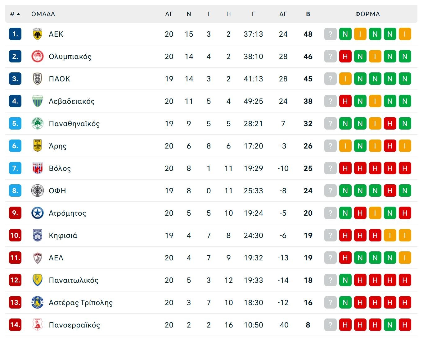Ο Παναθηναϊκός νίκησε με 1-0 τον Ολυμπιακό χάρη σε γκολ του Ταμπόρδα από το 7′. Με αυτή τη νίκη οι «πράσινοι» ανέβηκαν στους 32 βαθμούς και πλησίασαν στο -6 τον 4ο Λεβαδειακό των 38 βαθμών, με την ομάδα του Ράφα Μπενίτεθ να έχει και ένα ματς λιγότερο. Οι Πειραιώτες έπεσαν στη δεύτερη θέση με 46 βαθμούς και είναι στο -2 από την πρωτοπόρο ΑΕΚ.