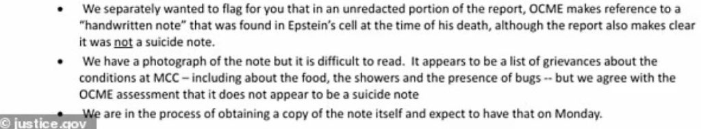 Τα αρχεία αποκαλύπτουν επίσης ότι οι ερευνητές βρήκαν ένα χειρόγραφο σημείωμα στο κελί του Επστάιν τη στιγμή του θανάτου του, το οποίο, σύμφωνα με τον ιατροδικαστή, δεν θεωρήθηκε σημείωμα αυτοκτονίας. Το σημείωμα περιλάμβανε παράπονα για τις συνθήκες κράτησης, όπως το φαγητό, τα ντους και την παρουσία εντόμων.