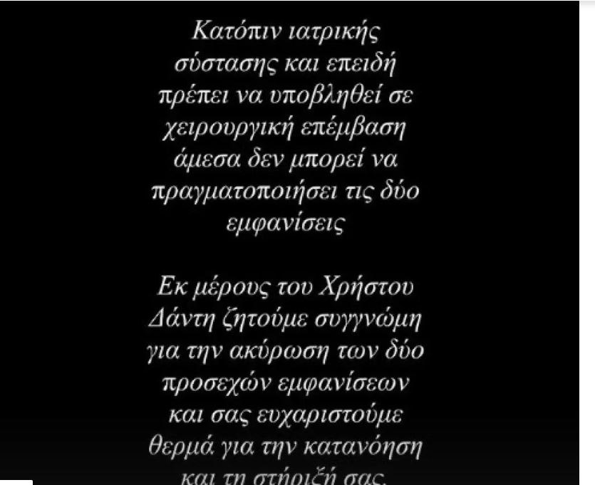 Εκ μέρους του Χρήστου Δάντη ζητούμε συγγνώμη για την ακύρωση των δύο προσεχών εμφανίσεων και σας ευχαριστούμε θερμά για την κατανόηση και τη στήριξή σας», έγραψε η Ασημίνα Χατζηανδρέου στην ανάρτησή της για το ατύχημα του Χρήστου Δάντη.