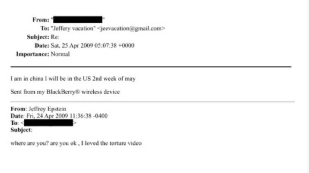 Ένα από τα πλέον αμφιλεγόμενα στοιχεία αφορά email με ημερομηνία 24 Απριλίου 2009, στο οποίο ο Έπσταϊν φέρεται να έγραψε: «Πού βρίσκεσαι; Είσαι καλά; Μου άρεσε το βίντεο βασανιστηρίων».