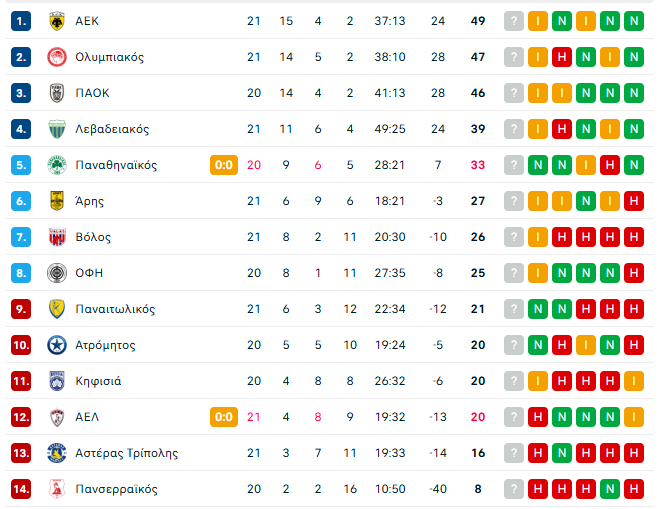 Η ισοπαλία στο ντέρμπι της Τούμπας για την 21η αγωνιστική της Stoiximan Super League διατήρησε τη μάχη για την κορυφή ανοιχτή. ΠΑΟΚ και ΑΕΚ αναδείχθηκαν ισόπαλοι 0-0, με την ΑΕΚ να παραμένει στην πρώτη θέση με 49 βαθμούς, ενώ ο ΠΑΟΚ βρίσκεται στην τρίτη θέση με 46, έχοντας όμως ματς λιγότερο.