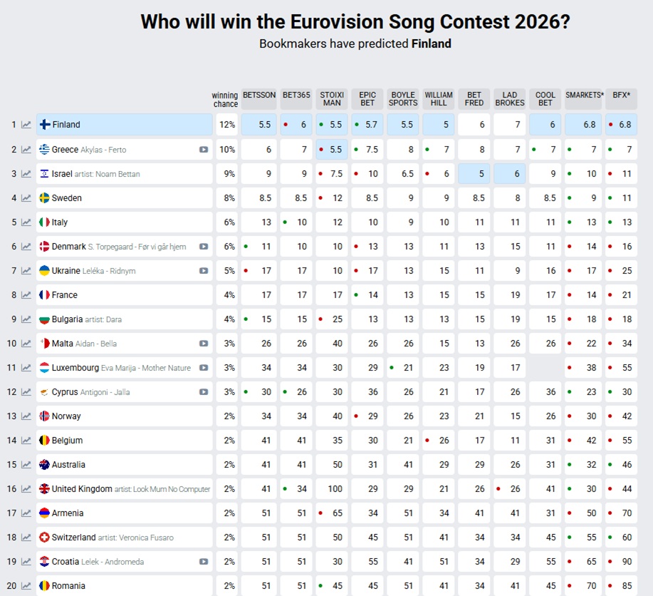 Μέσα σε λίγες ώρες η ελληνική συμμετοχή σημείωσε εντυπωσιακή άνοδο, μειώνοντας αισθητά τη διαφορά από την κορυφή. Στον συγκεντρωτικό πίνακα των στοιχηματικών εταιρειών, η Ελλάδα προσπέρασε το Ισραήλ, το οποίο παραμένει ψηλά, παρά το γεγονός ότι δεν έχει κυκλοφορήσει ακόμη το τραγούδι του. Πλέον, μπροστά βρίσκεται μόνο η Φινλανδία, που επίσης δεν έχει επιλέξει ακόμη κομμάτι, με τη διαφορά να χαρακτηρίζεται μικρή. Το «Ferto» κερδίζει συνεχώς έδαφος, παρασύροντας Eurofans και μη στον ρυθμό του.
