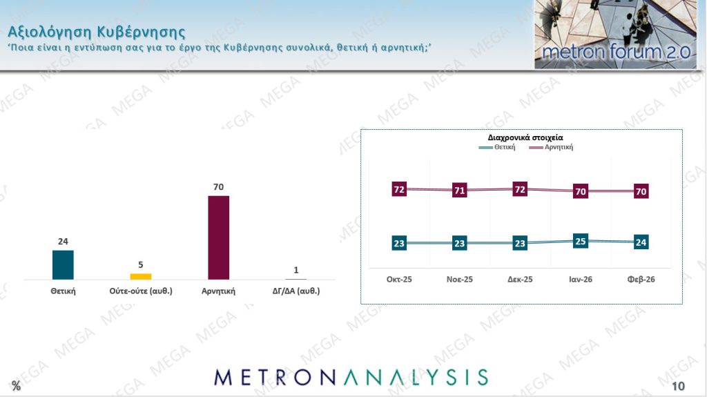 Έτσι, εξηγείται και το ότι 7 στους 10 πολίτες αξιολογούν αρνητικά την κυβέρνηση και σχεδόν ίδιο ποσοστό (68%) αξιολογεί αρνητικά και τον πρωθυπουργό Κυριάκο Μητσοτάκη.