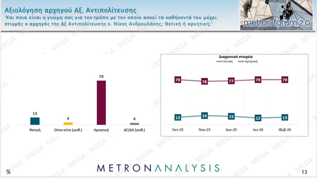 Ωστόσο, τα πράγματα δεν είναι καλύτερα για την αξιωματική αντιπολίτευση, καθώς το 81% αξιολογεί αρνητικά το ΠΑΣΟΚ, ενώ αρνητική αξιολόγηση λαμβάνει από το 79% και ο πρόεδρός του Νίκος Ανδρουλάκης.