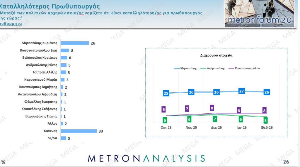 Ωστόσο, καταλληλότερος για πρωθυπουργός αναδεικνύεται ο Κυριάκος Μητσοτάκης με 26%, πίσω όμως από τον «κανένα» που απαντά το 33%, ενώ η δημοφιλής Ζωή Κωνσταντοπούλου θεωρείται καταλληλότερη για πρωθυπουργός μόλις από το 8%.