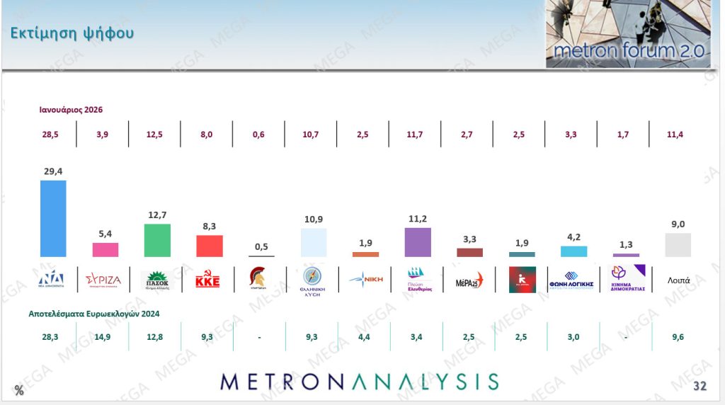 Στην εκτίμηση ψήφου η ΝΔ παραμένει μακριά από την αυτοδυναμία με 29,4%, ενώ το ΠΑΣΟΚ συγκεντρώνει 12,7%. Ακολουθούν Πλεύση Ελευθερίας με 11,2%, Ελληνική Λύση με 10,9%, ΚΚΕ με 8,3%, ο ΣΥΡΙΖΑ με 5,4%, η Φωνή Λογικής με 4,2%, το ΜέΡΑ25 στο 3,3%, η ΝΙΚΗ στο 1,9%, η Νέα Αριστερά στο 1,9%, το Κίνημα Δημοκρατίας στο 1,3%, οι Σπαρτιάτες στο 0,5% και τα υπόλοιπα κόμματα συγκεντρώνουν 9%.