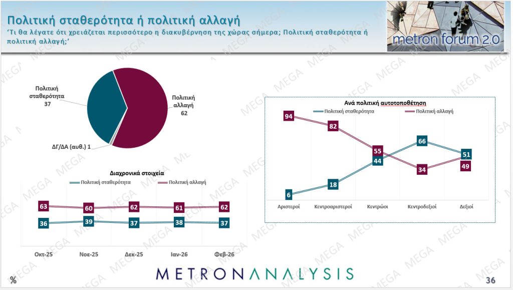 Στον πολυκερματισμό και την πτώση των ποσοστών των πρώτων στην πρόθεση ψήφων κομμάτων, δίνει εξήγηση η απάντηση στο ερώτημα τι χρειάζεται περισσότερο η διακυβέρνηση της χώρας σήμερα, με το 62% να απαντά πολιτική αλλαγή, έναντι μόλις του 37% που θέλει πολιτική σταθερότητα.