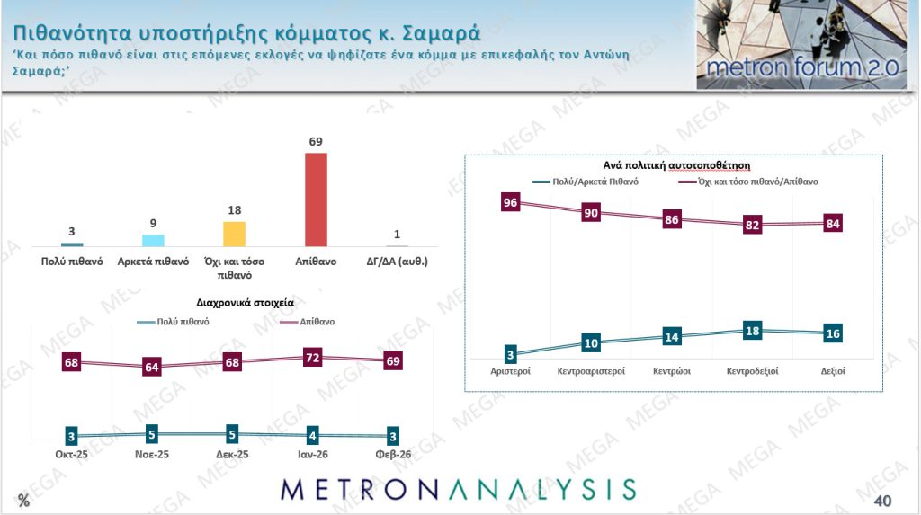Τέλος, όσον αφορά στον Αντώνη Σαμαρά, μόλις το 12% απαντά ότι είναι πολύ ή αρκετά πιθανό να ψήφιζε ένα κόμμα υπό την ηγεσία του, έναντι 87% που απαντά ότι δεν είναι και τόσο πιθανό έως απίθανο να τον ψηφίσει.
