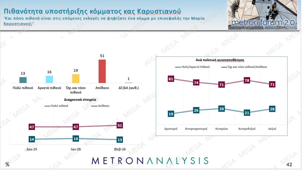 Η Μαρία Καρυστιανού θα είναι σύμφωνα με την δημοσκόπηση της Metron Analysis ο «παίκτης» που μπορεί να αλλάξει το πολιτικό παιχνίδι, καθώς στο ερώτημα «πόσο πιθανό είναι στις επόμενες εκλογές να ψηφίζατε ένα κόμμα με επικεφαλής την Μαρία Καρυστιανού», το 29% απαντά πολύ ή αρκετά πιθανό και το 70% όχι και τόσο πιθανό ή απίθανο.