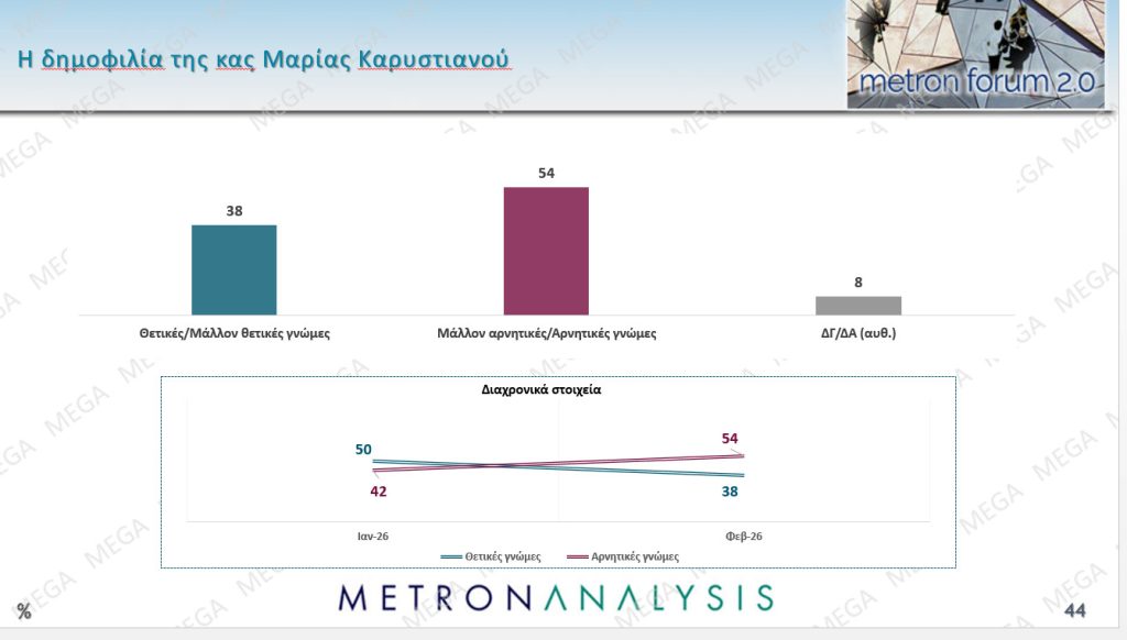 Μάλιστα, η δημοφιλία της ίδιας της Μαρίας Καρυστιανού ξεπερνάει αυτή του πρωθυπουργού Κυριάκου Μητσοτάκη, συγκεντρώνοντας 38% θετικές ή μάλλον θετικές γνώμες, έναντι 54% αρνητικών ή μάλλον αρνητικών τοποθετήσεων.