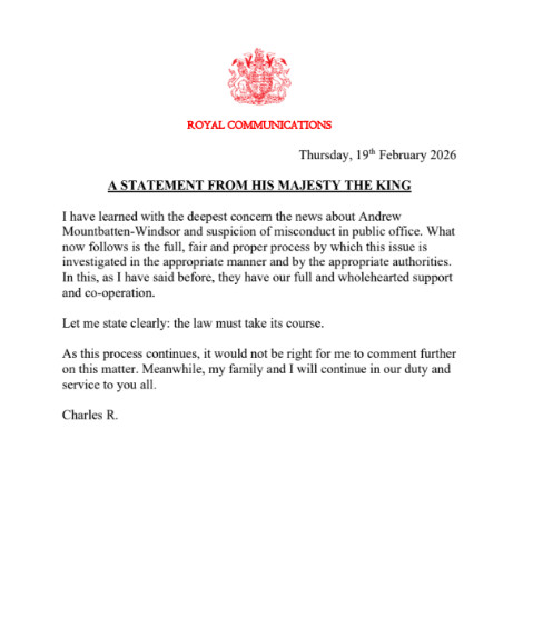 Ο 77χρονος Μονάρχης, με την ιδιότητα του “Charles R.”, εξέδωσε μια δήλωση που πολλοί αναλυτές χαρακτηρίζουν ως το «πιστοποιητικό θανάτου» της δημόσιας ζωής του Άντριου.