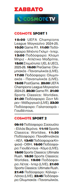 Στο COSMOTE SPORT 1, η δράση ξεκινά στις 10:00 με το UEFA Champions League Μαγκαζίνο 2024-25 και συνεχίζεται με σπουδαίους αγώνες, όπως το Ολυμπιακός – Παναιτωλικός (LIVE) στις 17:00. Το πρόγραμμα περιλαμβάνει επίσης τα παιχνίδια Μπόντο Γκλιμτ – Ίντερ και Κλαμπ Μπριζ – Ατλέτικο Μαδρίτης, καθώς και στιγμιότυπα από UEL & UECL 2025-26.