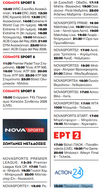 Τέλος, η ΕΡΤ2 μεταδίδει το ΠΑΟΚ – Παναθηναϊκός στο βόλεϊ (LIVE) στις 17:00, ενώ ακολουθεί ο τελικός του Allwyn Final 8 στο μπάσκετ στις 20:00.