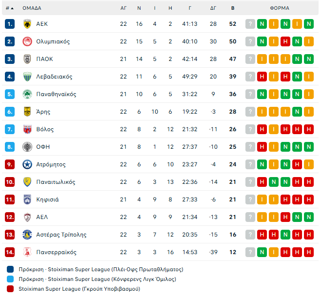 Η ολοκλήρωση της 22ης αγωνιστικής της Stoiximan Super League την Κυριακή (22/02) έφερε σημαντικές μεταβολές στον βαθμολογικό πίνακα, με πέντε αναμετρήσεις να καθορίζουν τις νέες ισορροπίες στην κορυφή και την ουρά.