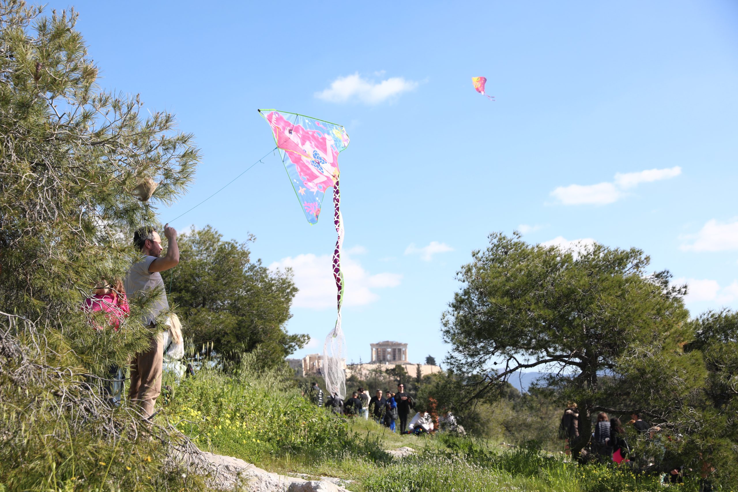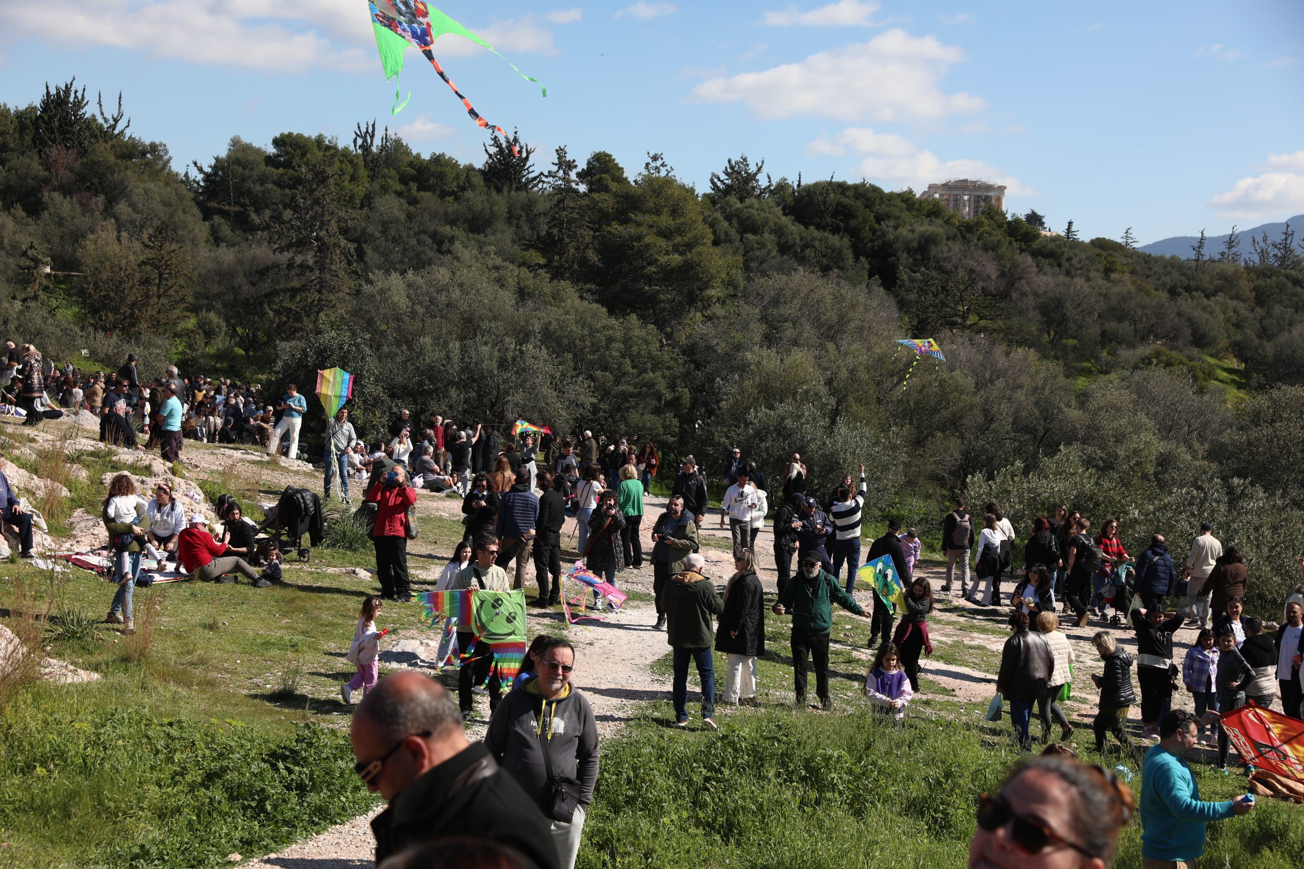 Με σύμμαχο τον καιρό, πολλοί Αθηναίοι ανέβηκαν στον λόφο του Φιλοπάππου για να γιορτάσουν την Καθαρά Δευτέρα.