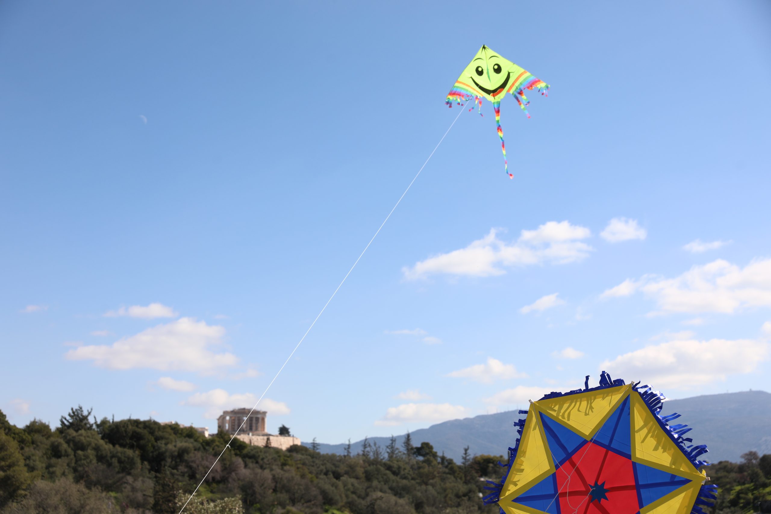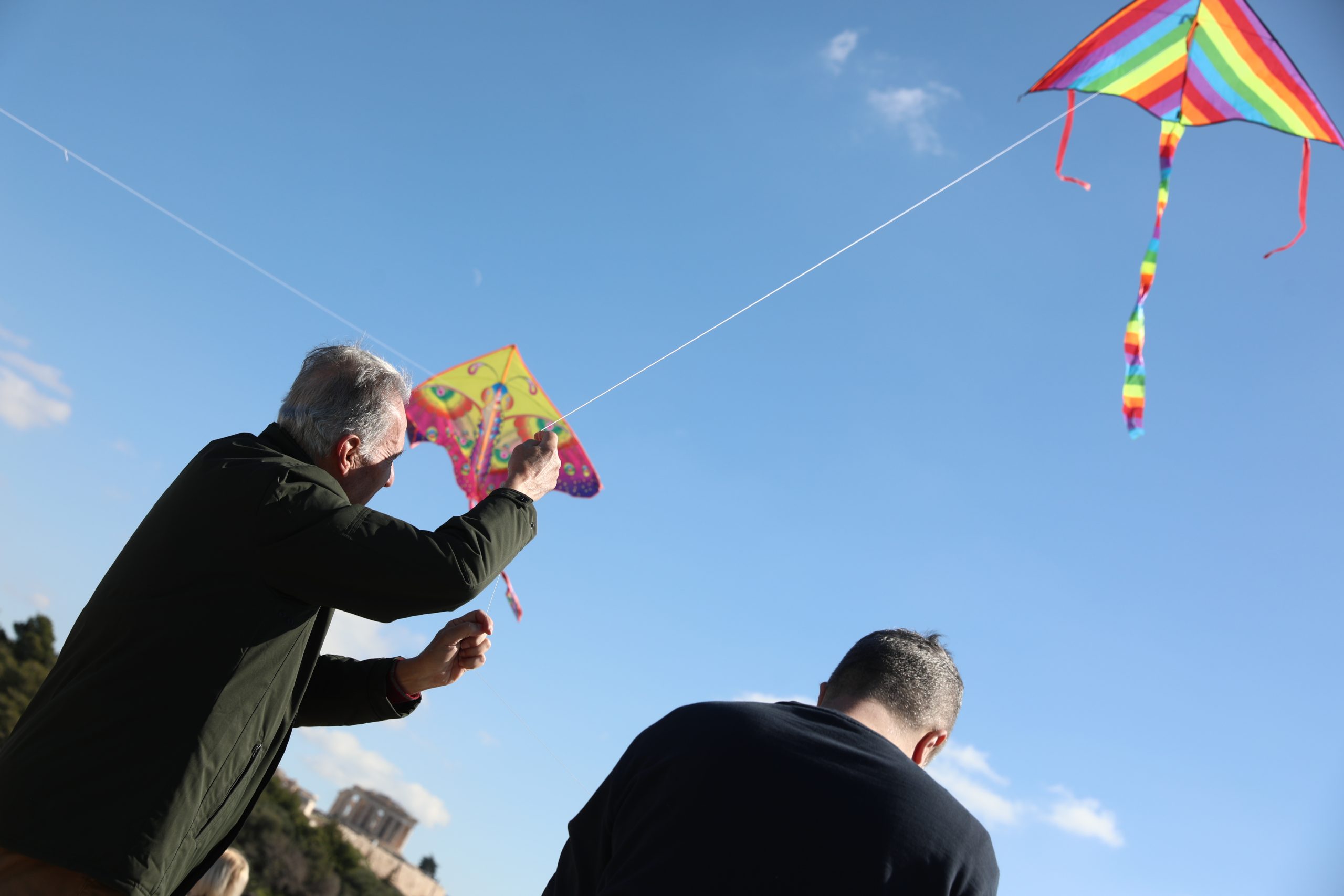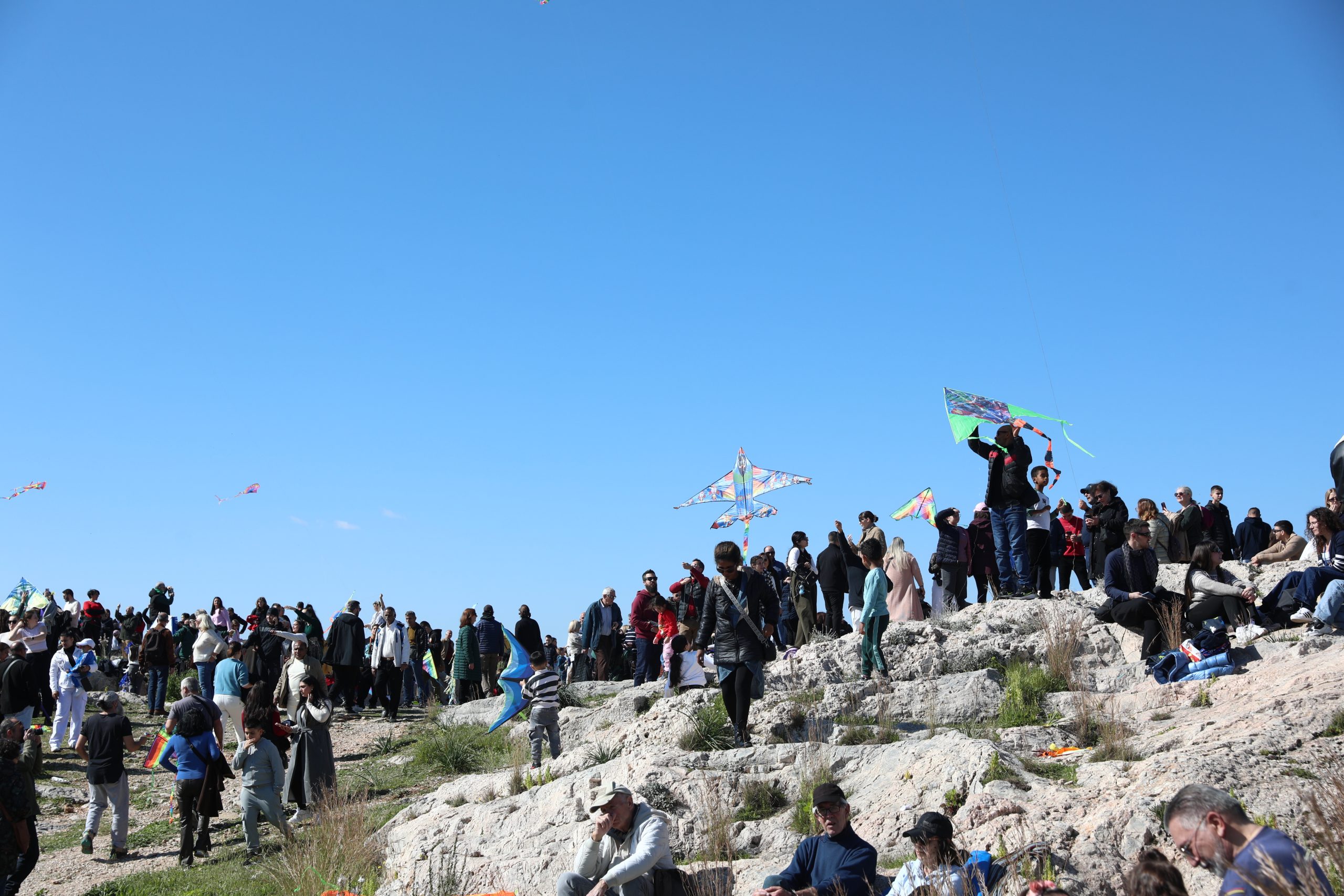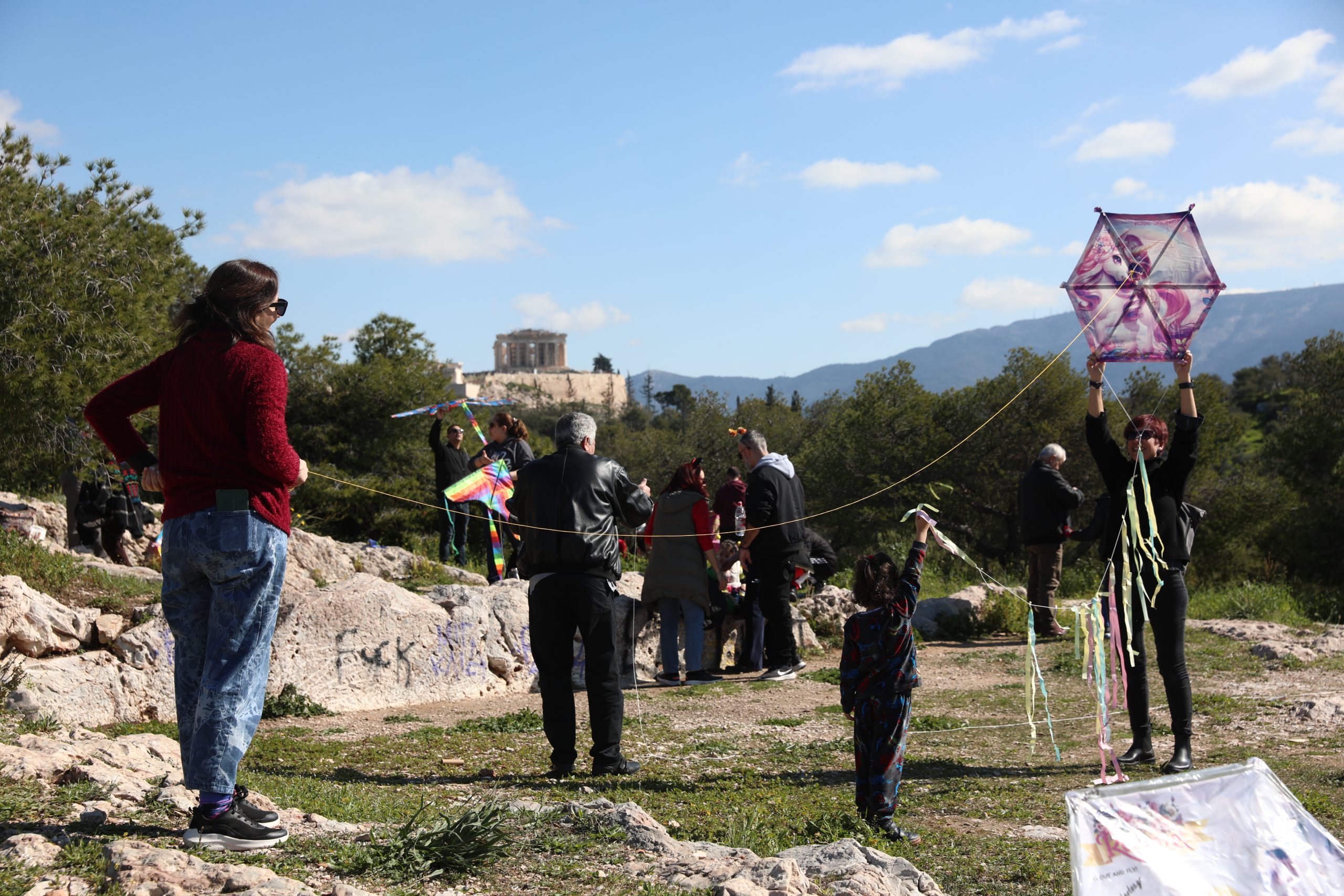 Ο ουρανός πάνω από τον λόφο του Φιλοπάππου γέμισε σχήματα και χρώματα, με μικρούς και μεγάλους να δοκιμάζουν την τύχη τους απέναντι στον άνεμο. Στο τραπέζι κυριάρχησαν τα σαρακοστιανά: λαγάνες, ταραμοσαλάτα, ελιές και θαλασσινά απλώθηκαν πάνω στις κουβέρτες, δημιουργώντας το κλασικό σκηνικό της ημέρας.