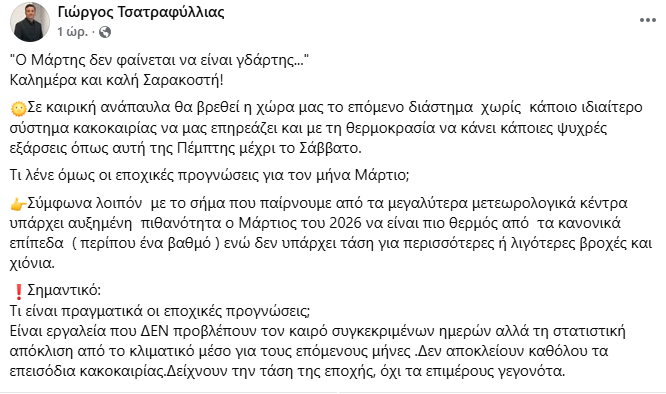 «Ο Μάρτης δεν φαίνεται να είναι γδάρτης» σημειώνει ο Γιώργος Τσατραφύλλιας, σε ανάρτησή του για τον καιρό και σημειώνει πως δεν αναμένεται κανένα σοβαρό σύστημα κακοκαιρίας.