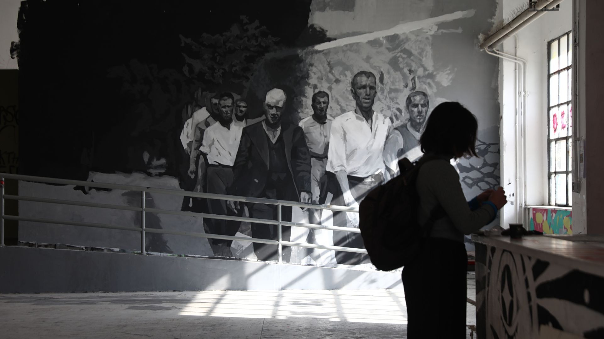 Οι φοιτητές επέλεξαν να μετατρέψουν σε τοιχογραφία μια από αυτές τις φωτογραφίες που έχουν προκαλέσει δέος στον κόσμο, η οποία και καθρεπτίζει τις τελευταίες στιγμές των εκτελεσθέντων, την Πρωτομαγιά του 1944.